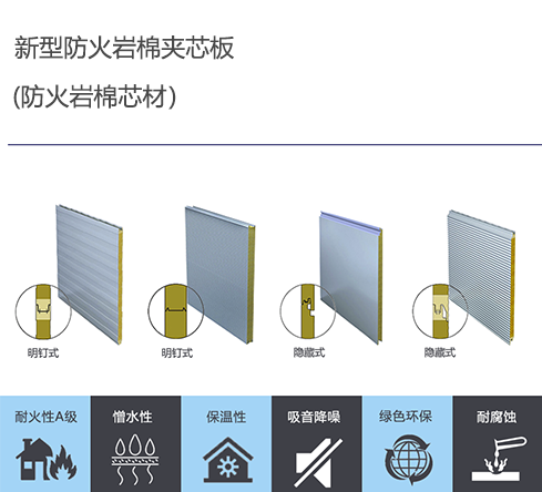 巖棉夾芯板是選用兩層高品質(zhì)的彩涂涂層鋼板或其他精密壓型的金屬板做面板,輥壓成型 后,將分條后的巖棉90度旋轉(zhuǎn)(使其纖維垂直于上下兩層鋼板),通過(guò)高強(qiáng)度、高粘結(jié)力、 高防火的粘結(jié)劑,將優(yōu)質(zhì)巖棉與金屬板粘結(jié)、復(fù)合而成美觀、平整、剛韌的建筑板材