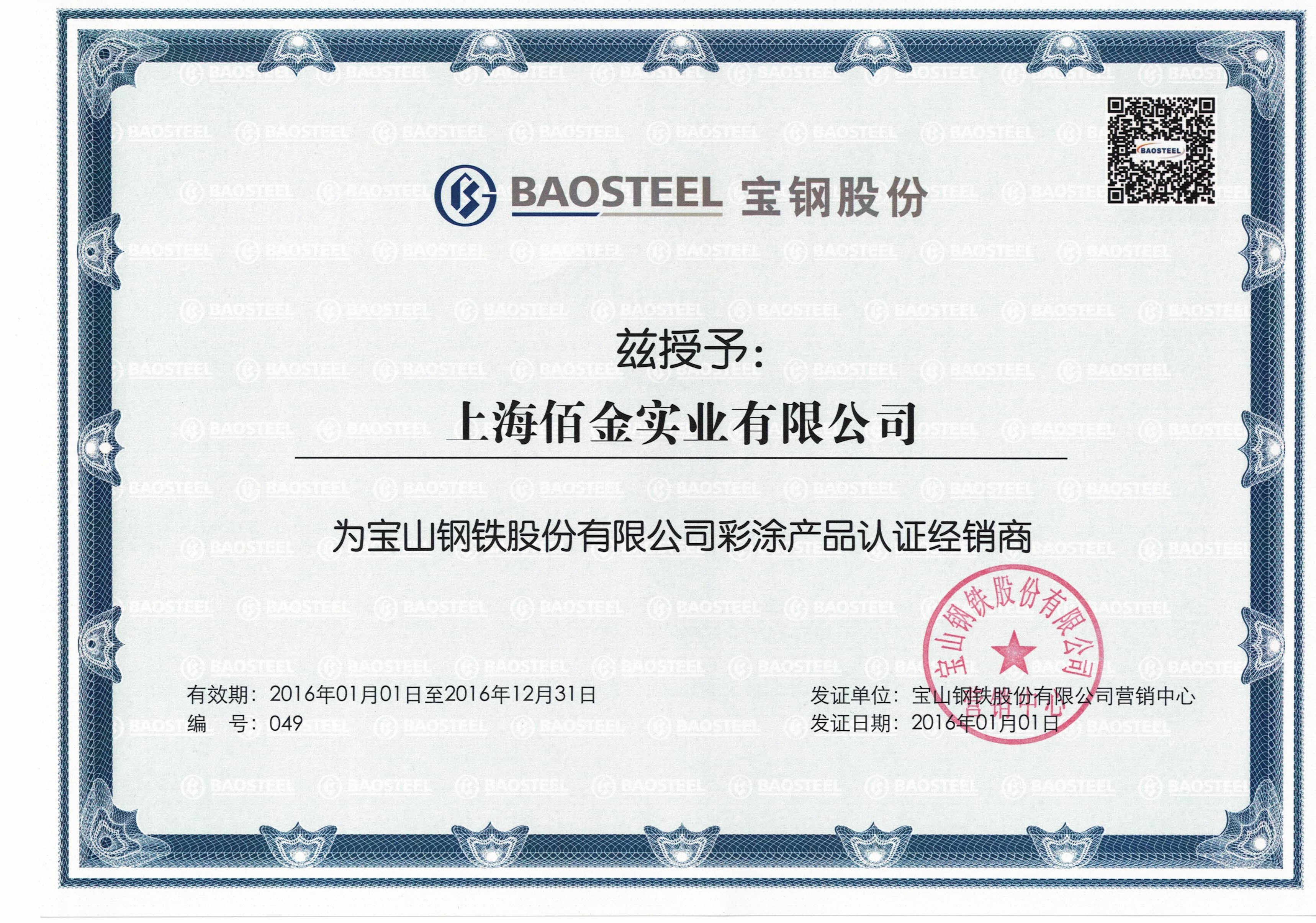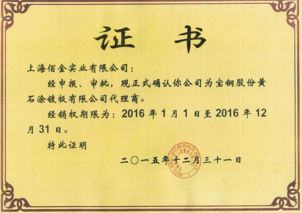 佰金華中銷售中心總公司上海佰金實(shí)業(yè)有限公司在幾年時(shí)間內(nèi),通過提供優(yōu)質(zhì)服務(wù),先后獲得了與寶鋼與寶鋼黃石等大品牌合作的機(jī)會(huì),獲取了他們的代理資格,代理證書如下: