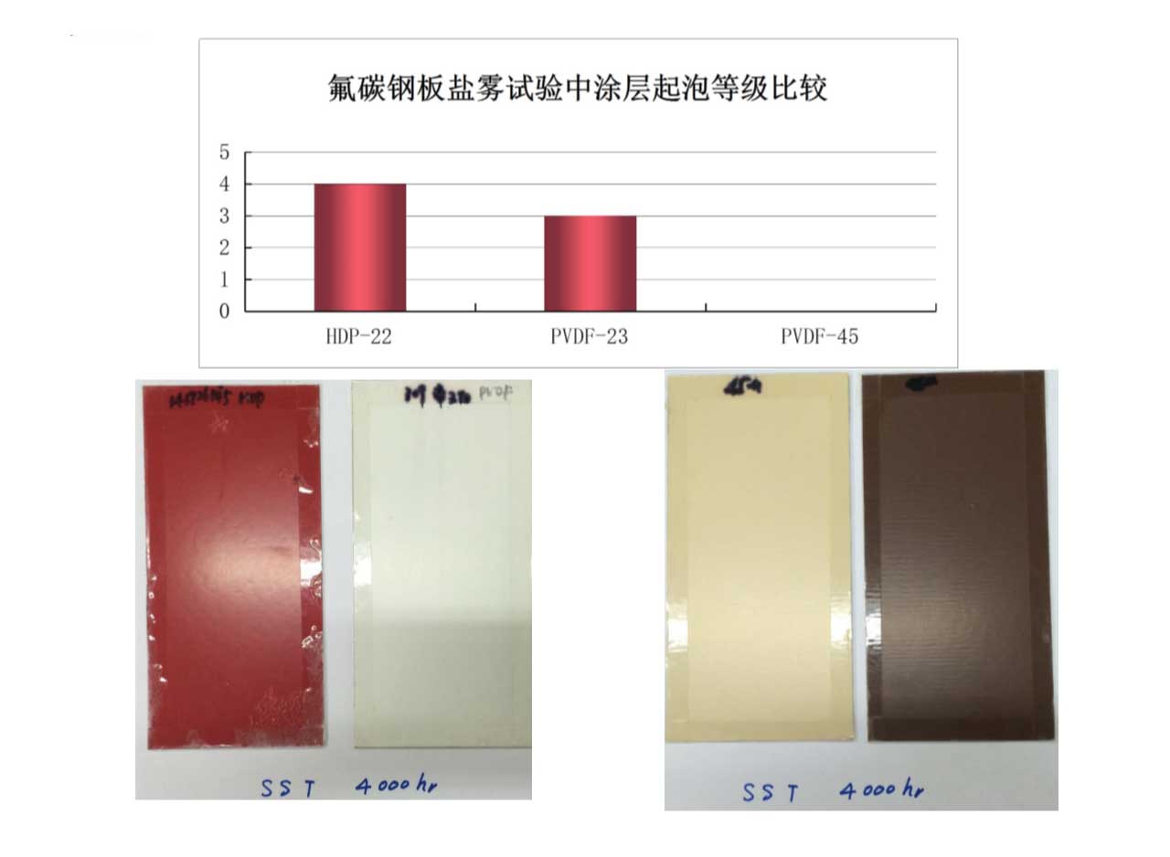 • 經(jīng)過4000小時鹽霧試驗后,45微米氟碳產(chǎn)品涂層仍保持0級。