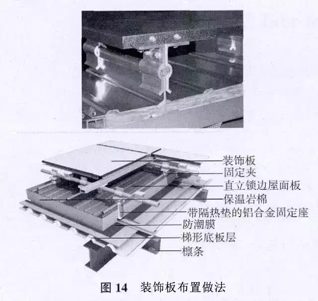 裝飾板系統(tǒng)的連接固定,無需在鋁鎂錳合金板上開洞;兩層板之間的開放式連接,無需維護,并可降低清理要求;可調(diào)節(jié)系統(tǒng)使裝飾板可完美布置,裝飾板布置做法見圖14。